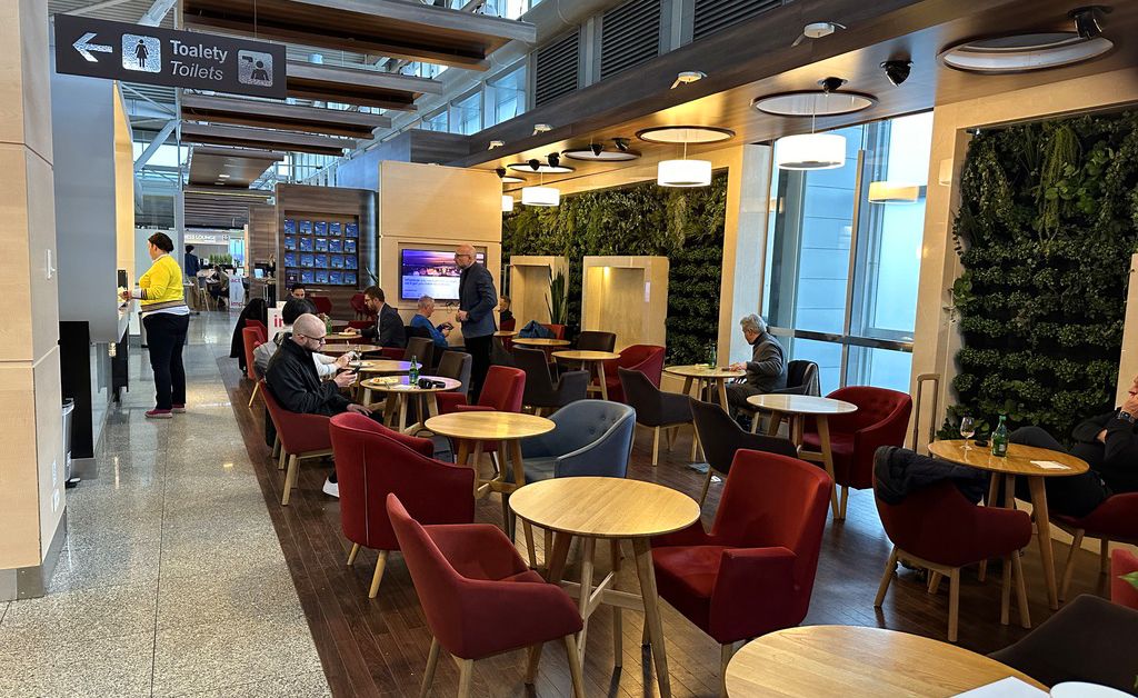 LOT:s Lounge på Warszawas flygplats Frédéric Chopin får pluspoäng för sin storlek och service. Det är fem timmar till anslutningen till Arlanda kl 17:10. Loungen saknar tyvärr skönare fåtöljer för en så lång väntan, men har gott om småbord med fåtöljstolar där man kan sitta käpprätt och jobba. Bara drygt hälften av dem har nära till eluttag. Därför fylls den delen upp av gäster, medan den andra halvan eller tredjedelen förblir tom på folk.
