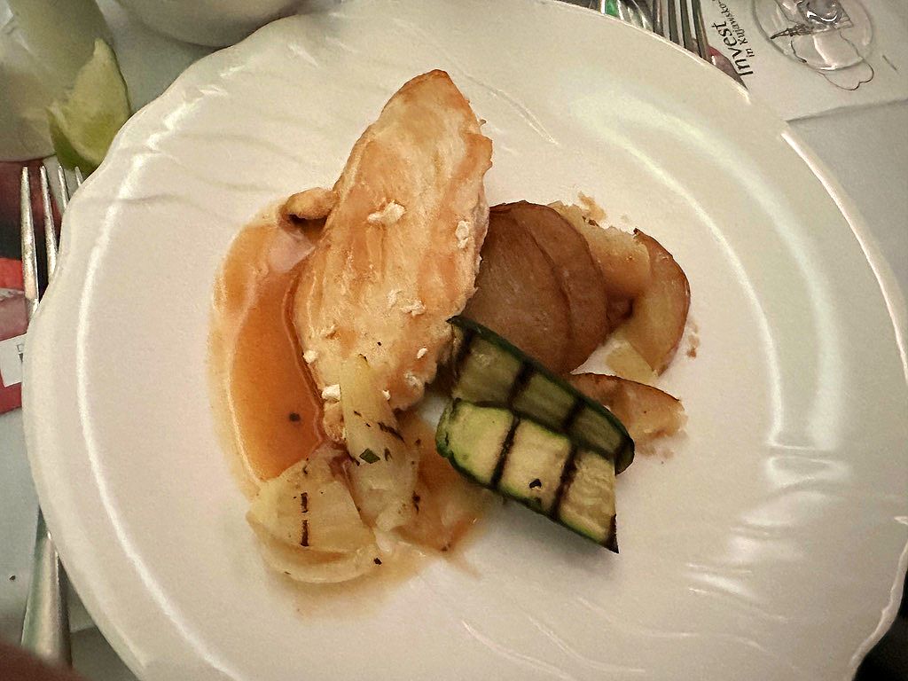 Värdinnorna och servicen är alldeles utmärkta och maten godkänd. Huvudrätten är grillat kycklingbröst med grönpepparsås gratinerad med potatis och zucchini. Fiskalternativet en tilapiafilé och det vegetariska en ostravioli med puttanescasås. Till dessert finns en fruktsallad eller flera rätt tunga kakalternativ (brownie, ostkaka) som jag fort hoppar över. Ostbrickan består av brie, Saint André och en röd cheddar.