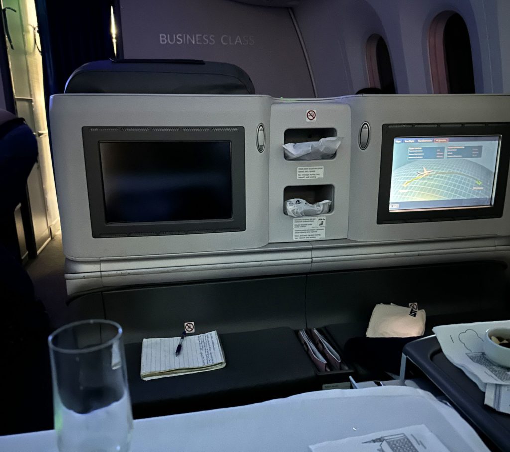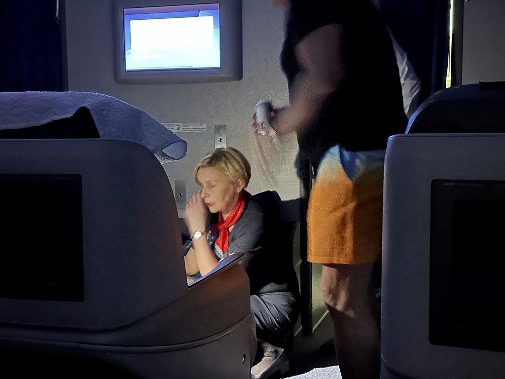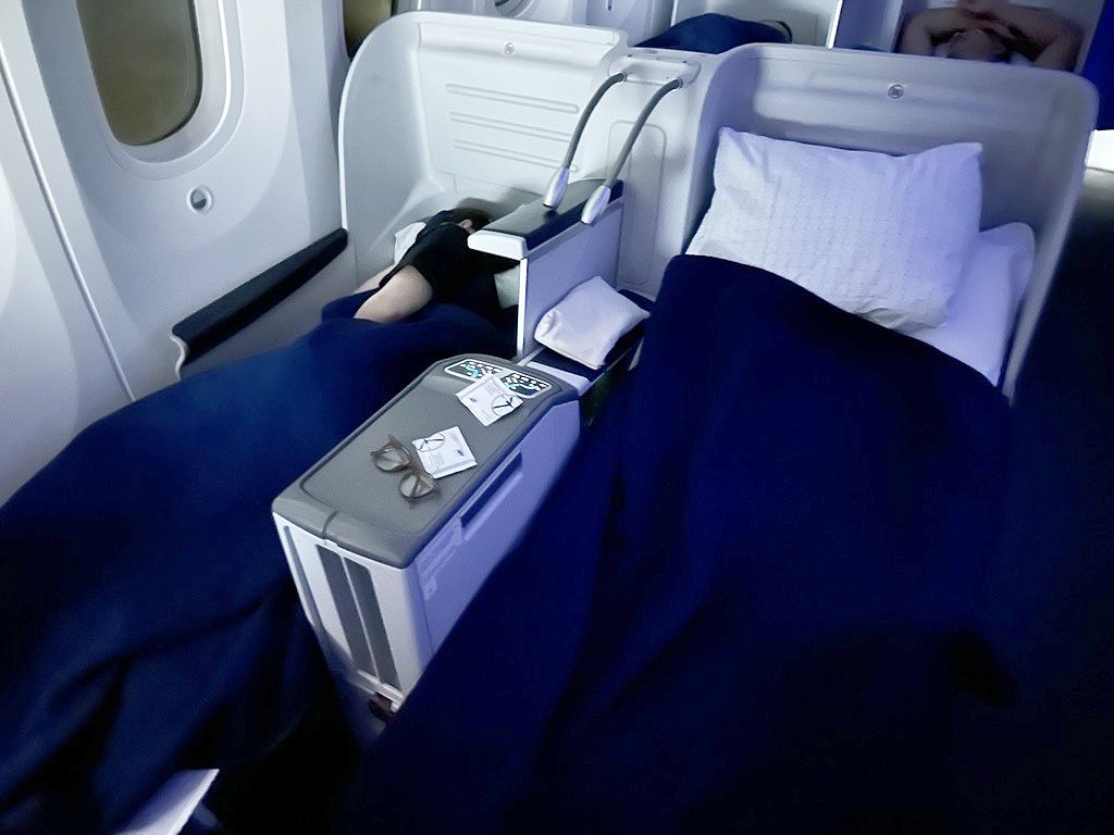 Frukosten är rejäl på sina fyra olika småfat, fast tyvärr orkar man inte äta så mycket i denna tidiga timme, som motsvarar 04:30. För oss som har beställt väckning till frukost lyser en liten ettrig grön lampa hela natten bredvid ryggstöden, som indikation för värdinnorna. Den är irriterande, varför jag avbeställer väckningen enkom för att slippa den. Tilläggas ska också, att sätena ofta får mekaniska fel. I raden framför mig jobbar personalen i minst en timma, vilket blir väldigt störande, med att reparera ett säte som på något vis har fastnat under sin väg från fåtölj till flat-bed. Det kan inte ha varit roligt för den som satt bredvid den lilla verkstaden.