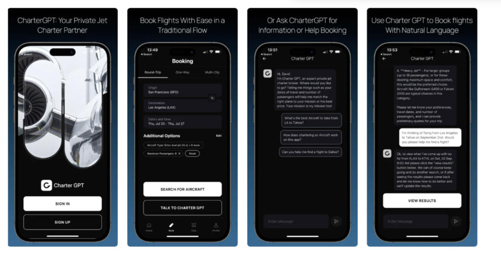 Ett sådant exempel är CharterGPT som lanserades i augusti. Den vänder sig till marknadssegmentet av främst affärsresenärer som tillsammans med kunder reser med privatjet. Tanken med appen är att snabbt och lätt kunna se över och boka något av de privatplan som företaget Jet.AI har i sin flotta. Efter att ha svarat på frågor gällande till exempel resmål, antal passagerare, avrese- och ankomstdatum hjälper en chatbot till att lotsa användaren till en anpassad offert och bokningssida.