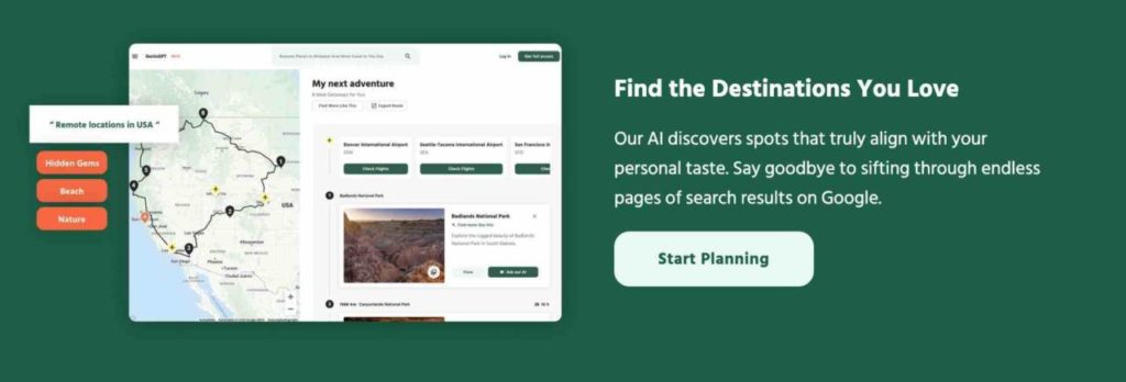 Det webbaserade verktyget GenixGPT har riktat in sig på en tredje nisch: att rekommendera resmål i kategorierna orörda stränder, dolda pärlor, hemliga samt förtrollande platser. Processen börjar med att användare skriver in ett öppet önskemål. Det följs i sin tur upp av AI-genererade frågor för att ringa in olika, personligt anpassade alternativ. De första åtta sökningarna är gratis, därefter kräver GenixGPT en engångsavgift på motsvarande 55 kronor.