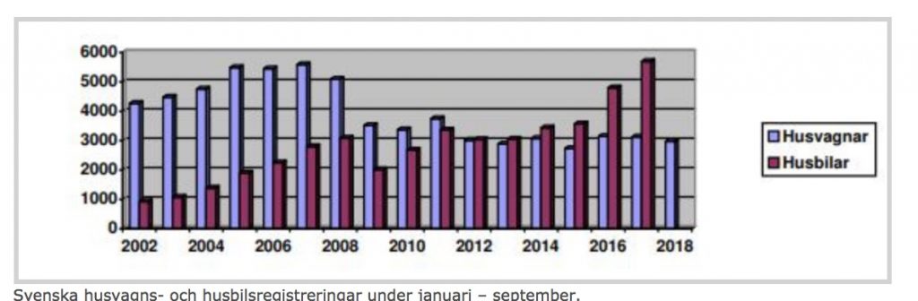 Hittills under 2018 betyder det 2 974 registrerade husvagnar mot 3 129 under samma period 2017. I procent innebär detta en minskning med 4,95 procent.