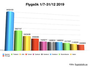 Det mest eftersökta landet är fortsatt Spanien, men de noterar en nedgång på 89 procent. Från 6 432 433 sökningar förra året till årets siffra: 686 884.
