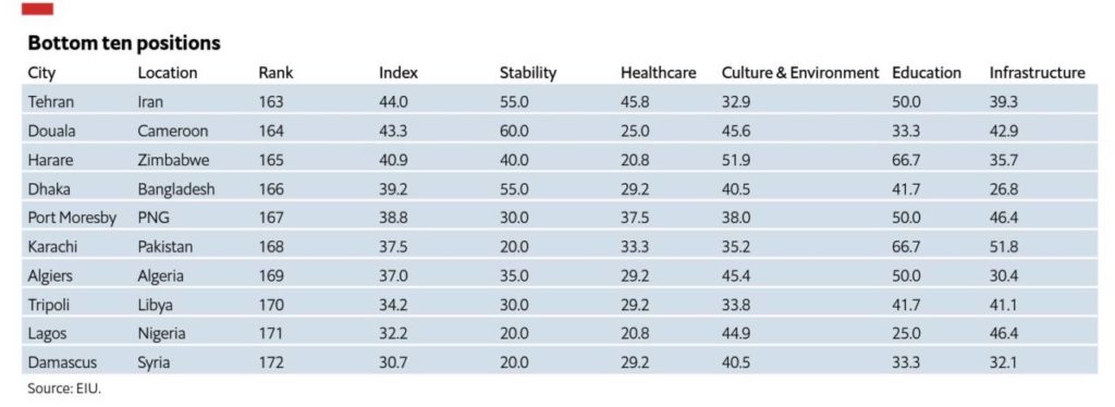 I botten på samma lista finns städer som Tripoli i Libyen, Lagos i Nigeri och Damaskus i Syrien.
