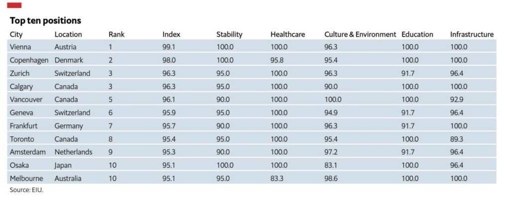 Ännu en stadslista. Indexet från The Economist väger samman stadsfaktorer som stabilitet, hälsovård, kultur, utbildning och infrastruktur. Mest dominerande på tio-i-topplistan är Kanada med tre städer: Calgary, Vancouver och Toronto.