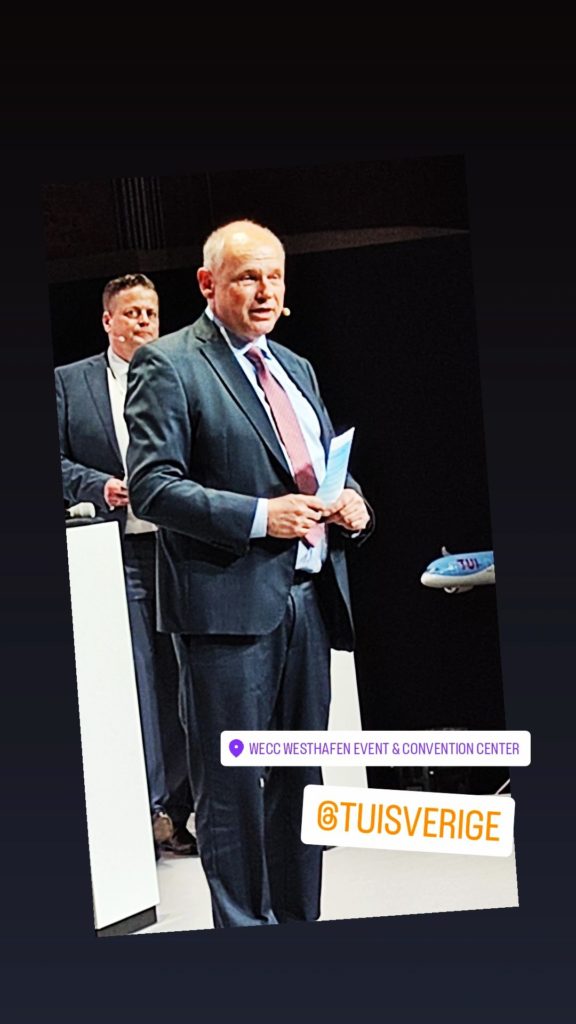 Det var sittande trerätters middag och den inleddes med att TUI:s koncernchef Sebastian Ebel presenterade hela sin ledningsgrupp Den bestod av nio män och en kvinna. Sen förklarade Ebel att om det hade varit fler turister i Ryssland och Ukraina hade det inte blivit krig. Det håller jag med om. Turism skapar ett välstånd som gör att man inte behöver råna sin granne. Han trodde på en tillväxt och planerar att växa med 8 procent. Med lönsamhet. Med dynamisk paketering och förstås på nya marknader. TUI vill in i Spanien och Portugal i år och i USA nästa år. TUI ska förstås konkurrera mer med Booking och Expedia. Till hjälp har Sebastian 63 000 medarbetare i hela världen. Budskapet var att det är tuffa ekonomiska tider nu, men allt tyder på att få offra semestern ändå. Exakt samma bild som jag har alltså.
