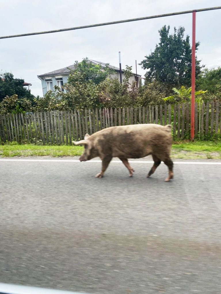 Sen bär det av mot Batumi. Vägen påminner om en svensk landsväg, men det är rikligt med hål i asfalten. I väggrenen står ofta kor och betar. Några är fastsurrade i marken, men de flesta betar fritt. Vi ser även några getter, men bara en gris som går fritt. Ibland ser man en gubbe som jagar en ko, men annars tycks djuren klara sig själva och vara vana vid fordon som kör förbi i 90 knyck.