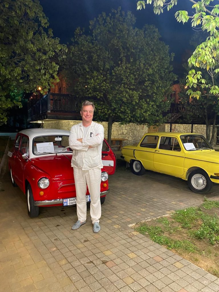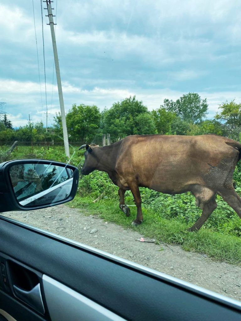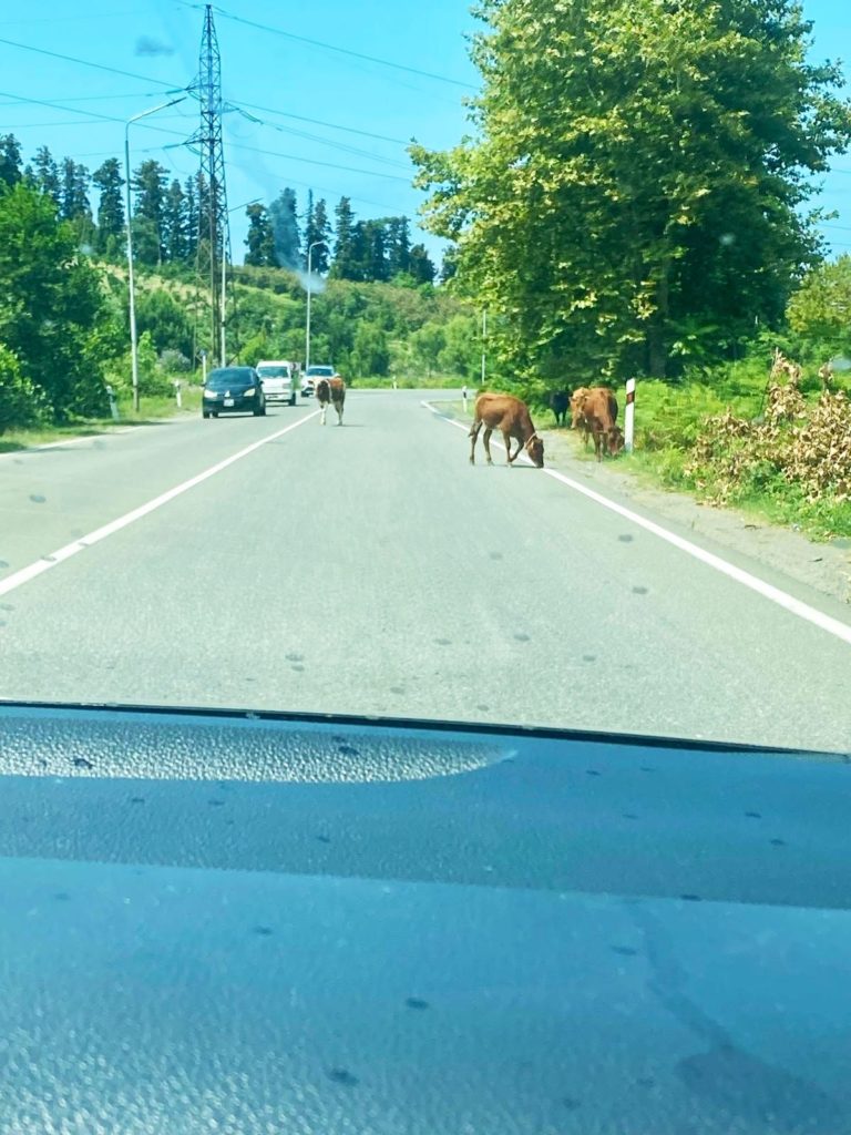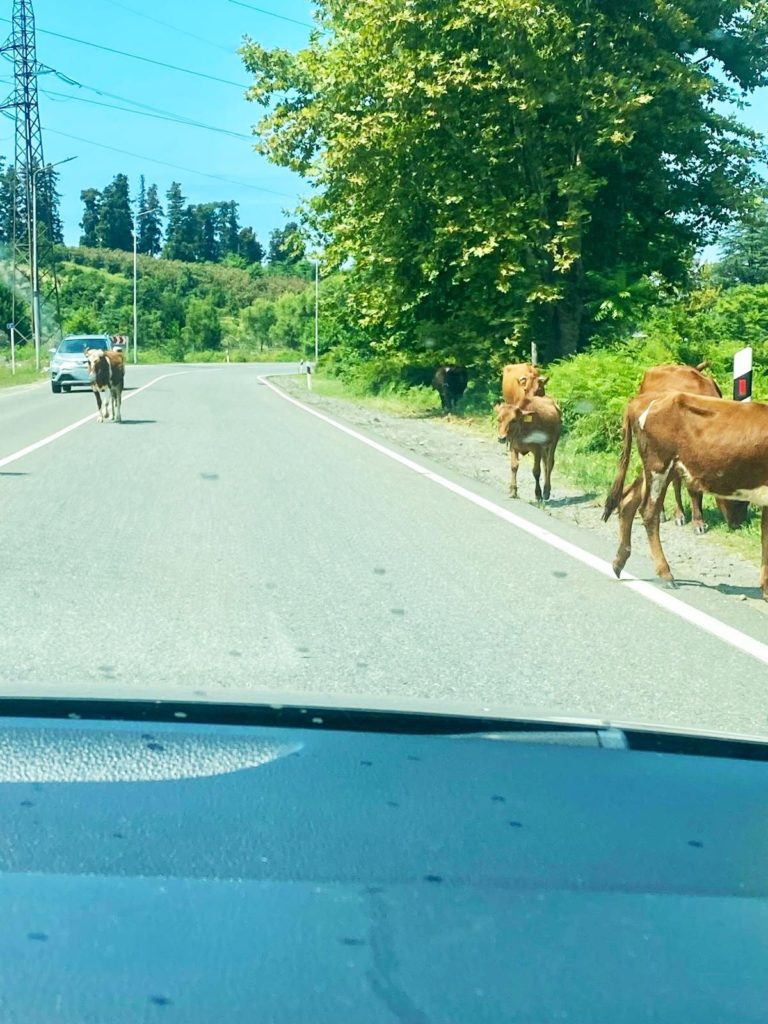 Folk kör som galningar i Georgien. Ju större bil desto mer rätt att bryta mot trafikregler som att köra över heldragna linjer och våghalsiga omkörningar. Det första som händer när jag rullade ut på motorvägen efter flygplatsen var att en Mercedes kom körande rakt mot mig och färdriktningen. Nu har jag vant mig och mitt motdrag är att köra lugnt och försiktigt. Faktum är att korna som går lösa i vägrenen har en lugnande effekt, djuren vaggar fram på vägen som om de ägde den.