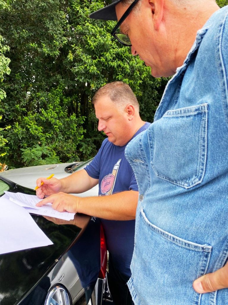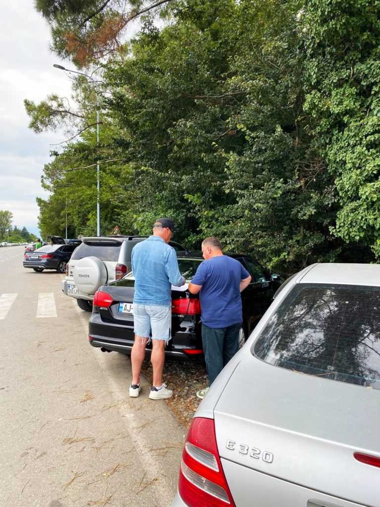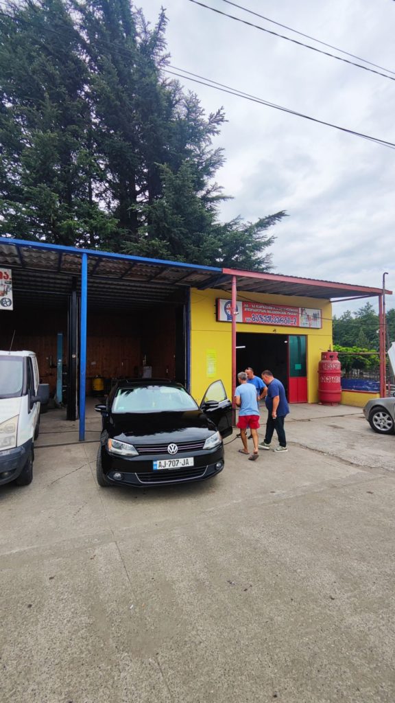Håller vad de lovar gör vårt hyrbilsföretag Carrentingingeoriga, efter några minuter dyker Besso upp med vår svarta Volkswagen. Han har kontoret på fickan så jag skriver på avtalet på bagageluckan ute på parkeringsplatsen. Jag har även haft kontakt med Lasha som undrar om jag vill betala med kryptovaluta, men jag föredrar US-dollar. Besso kör oss till en verkstad där vi fyller på med luft i däcken och sen kör jag tillbaka honom till flygplatsen.
