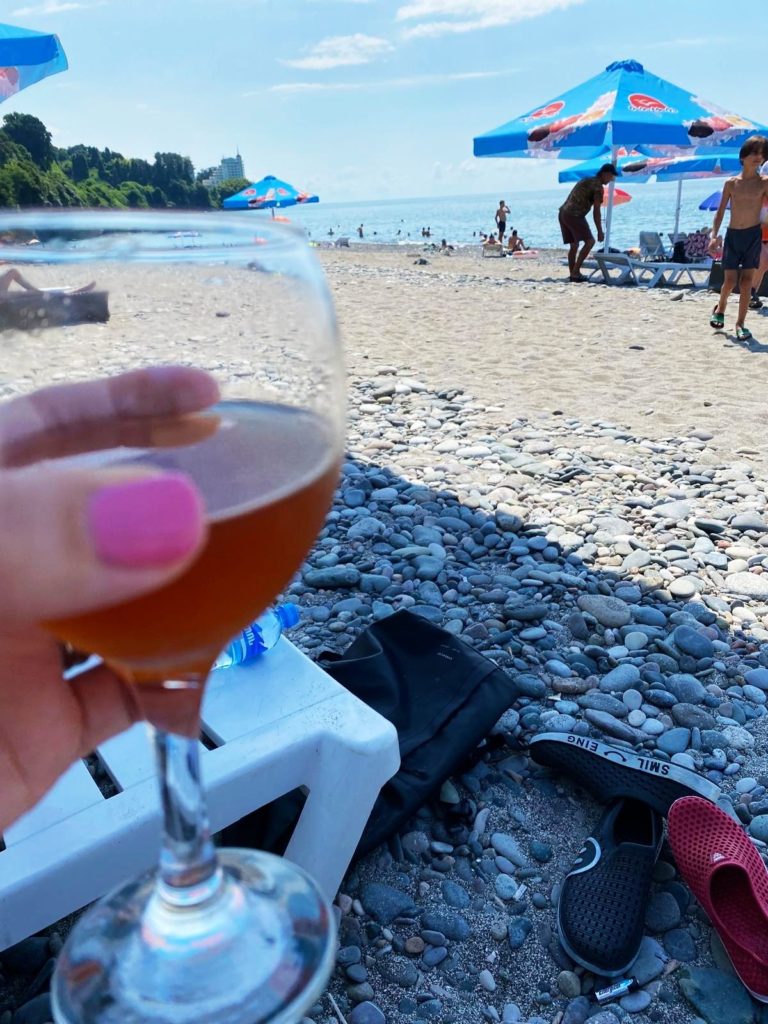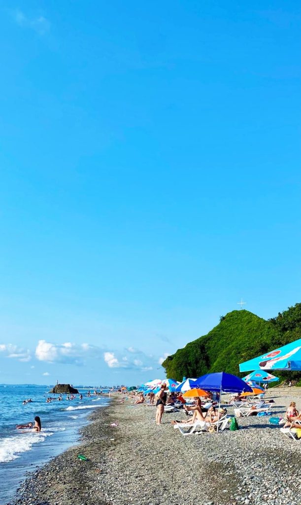 Kör norrut och landar på hipsterstranden Petra en knapp timme från Batumi. Här ser vi människor med samma sorts tatueringar som på Södermalm och det serveras odrickbart naturvin. Naturen är sagolikt vacker och havet lugnt som en filbunke. Då och då tutar ett långt godståg som kör förbi. Strandbaren serverar pizza, grillade grönsaker och kokt majs. Mums.