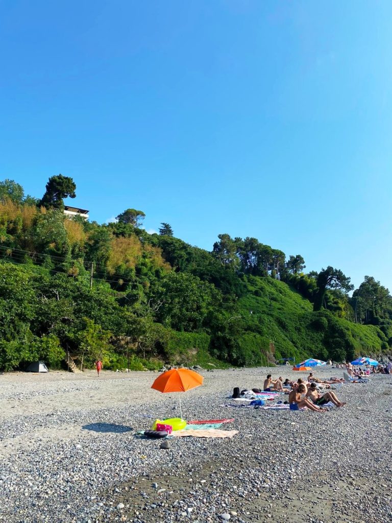 Vi hänger på en stenstrand i Kvariati en halvtimme söder om Batumi. Inhandlar ett par mockasiner i gummi för att kunna gå på de glödheta stenarna. Man halkar runt på stranden som i kvicksand utan vettiga skor. Det är allt annat än långgrunt utan botten stupar rakt ner i havet. Svarta havet har djup på över 2200 meter. Men det salta vattnet ger ljuvlig svalka. Vi ligger under ett gigantiskt parasol, något jag rekommenderar ty solen är minst sagt stekande.