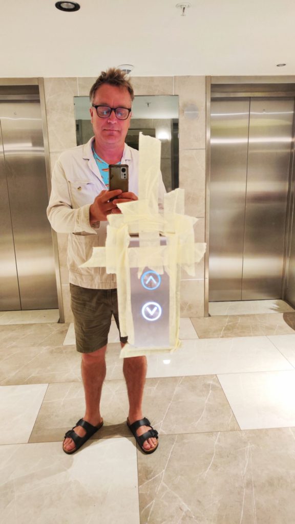 Den stora utmaningen i vårt hus är hissarna. Det finns tolv stycken fördelade i två schakt. Dessa ska alltså serva 5 000 lägenheter. På bottenplan är det alltid kö och för att komma in i hissen måste man tränga sig. Att vänta på sin tur gäller inte i detta land. Väl inne i hissen stannar den överallt och släpper av och på människor. Värst är det att komma till frukosten på våning 40 eftersom vi på våning 30 bara kan åka till ettan innan vi kan åka uppåt. Det tar ungefär fem minuter att komma från rummet ut på gatan. Men sängen är skön och utsikten från vår balkong vidunderlig över stad och hav.