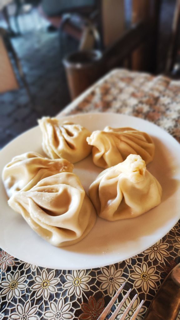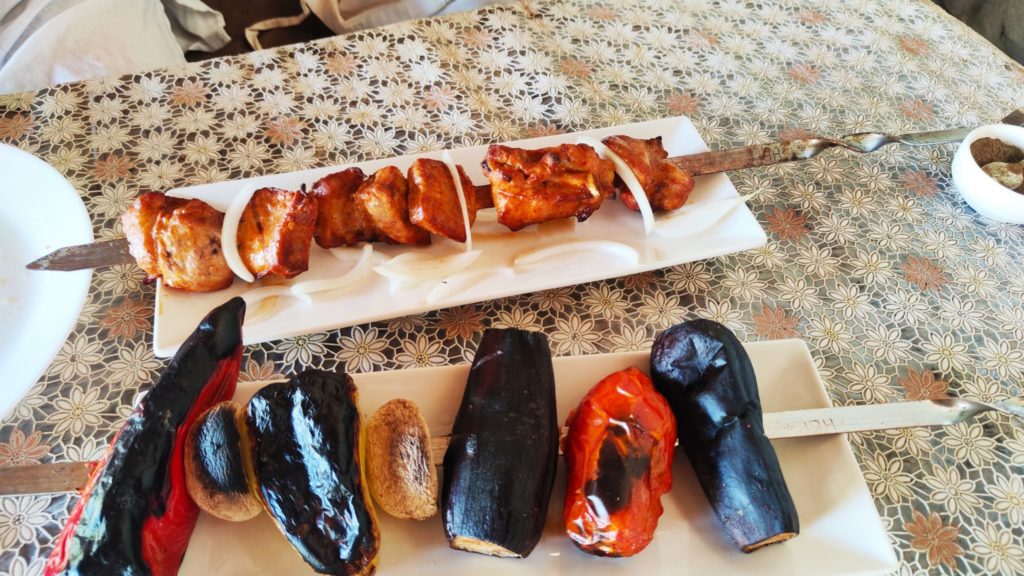 Idag åt vi Khinkali, en av Georgiens nationalrätter, för första gången. Det var ljuvligt gott. I ett degknyte finns malt kött och färska kryddor vilket ger en underbar buljong. Maten här anses vara fantastisk, jag kan bara hålla med eftersom jag älskar enkel mat. Grillade grönsaker är just exakt detta. Kebab är lammfärsbullar i tunnbröd. Glöm vitlökssås och en massa kvalmiga grönsaker.