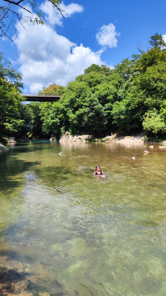 Enligt en guide på nätet som Anna hittade kunde man bada i floden en kort promenad bort. Det visade sig vara några kilometer så vi tog bilen. Här var det bara några få locals som badade, fiskade och hängde. Att ligga stilla i en strid, sval flod när det är stekande hett är en befrielse. Det går att simma mot strömmen, men bara Sarah Sjöström kommer någonstans.