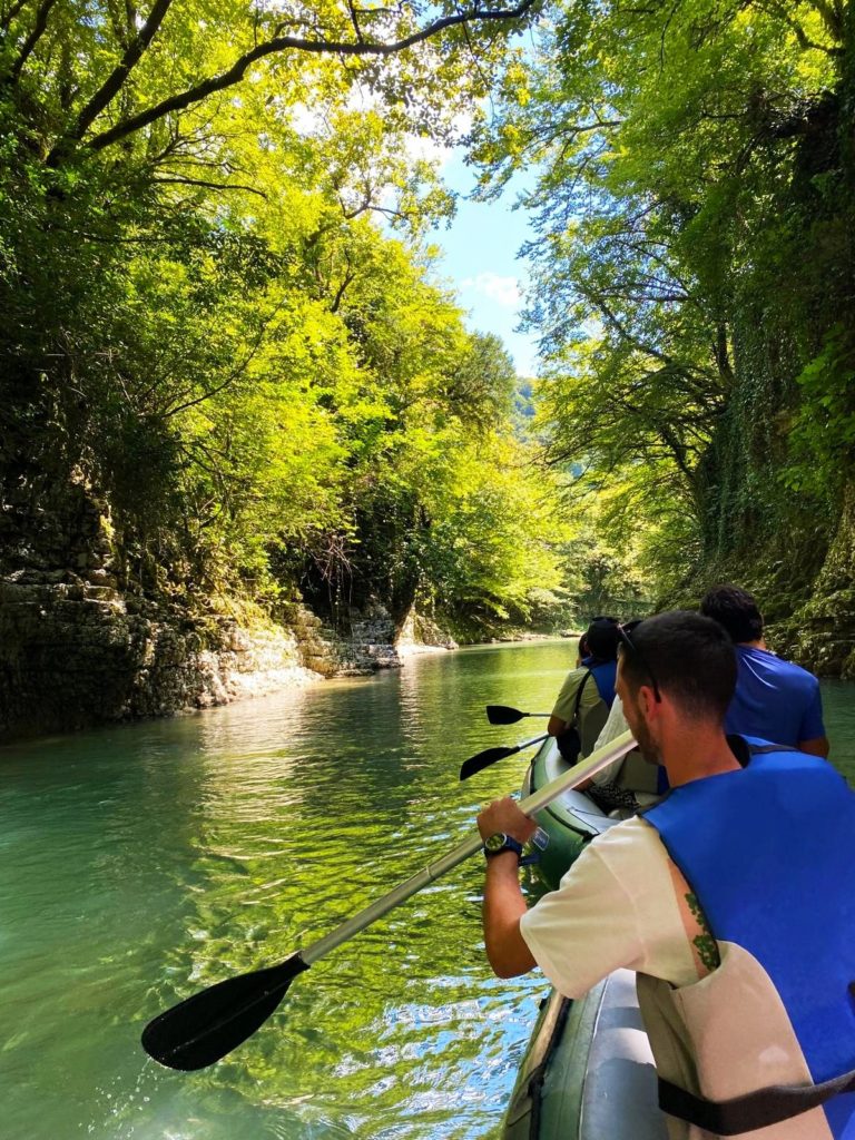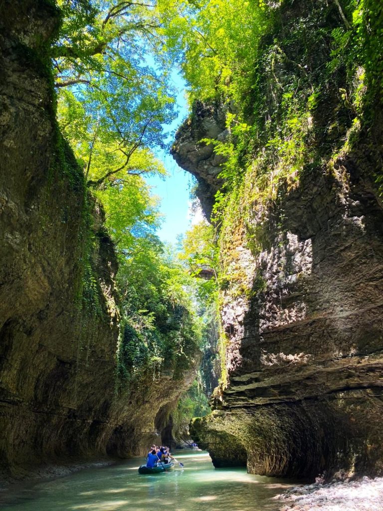 Sista heldagen i Georgien körde vi inåt landet till Martvili Canyon, en ravin med ett vattenfall som varenda turoperatör och taxichaufför i Batumi säljer utflykter till. Sånt kan ju göra en “reseexpert” en smula skeptisk, men det visade sig vara helt magiskt. Vi var visserligen inte ensamma i vår lilla gummibåt och inte heller båten var ensam i det gröna kalla vattnet från bergen, men naturens egen katedral var ändå overkligt vacker. Det porlande vattnet gav svalka, på parkeringsplatsen var det minst 30 grader i skuggan om det överhuvudtaget hade varit någon skugga där. När vi satt i gummibåten gav lövverket 20 meter upp skydd från den stekande solen. Jag förstår varför ambassaden tyckte att vi skulle åka hit.